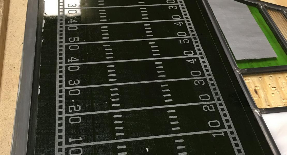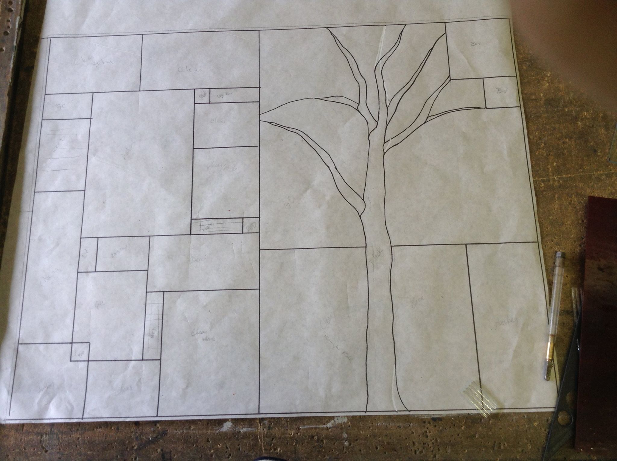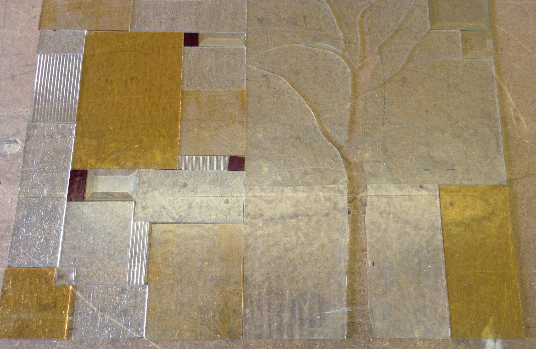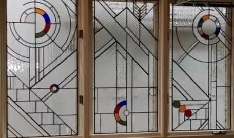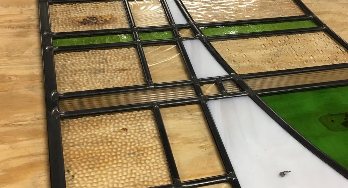 Stained glass, painted glass and sandblasting.